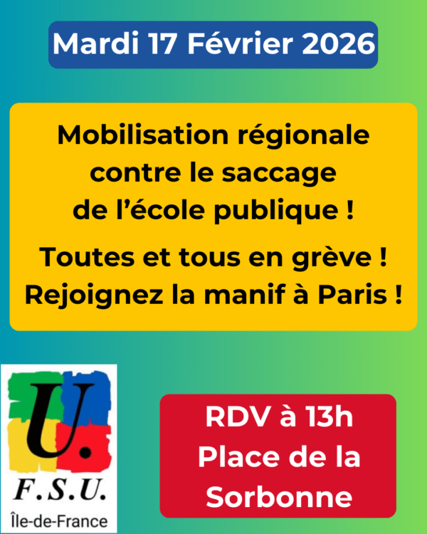 La FSU IDF appelle à la grève et à une mobilisation massive le mardi 17 février pour exiger des moyens à la hauteur des besoins ! Soyez nombreuses et nombreux à nous rejoindre dans la rue !